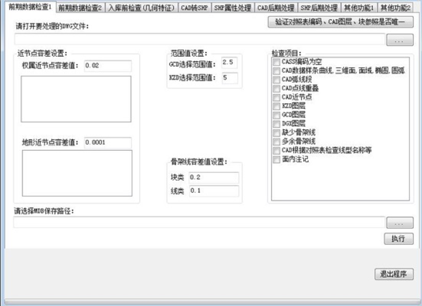 地形數據質檢及入庫工具軟件是根據實際的CAD數據入庫項目而研發的一款輔助檢查入庫的工具軟件,有著較強的項目適應性。主要功能有工程管理、數據庫建立、CAD數據檢查、格式轉換、拓樸處理、SHP數據檢查、數據入庫等。